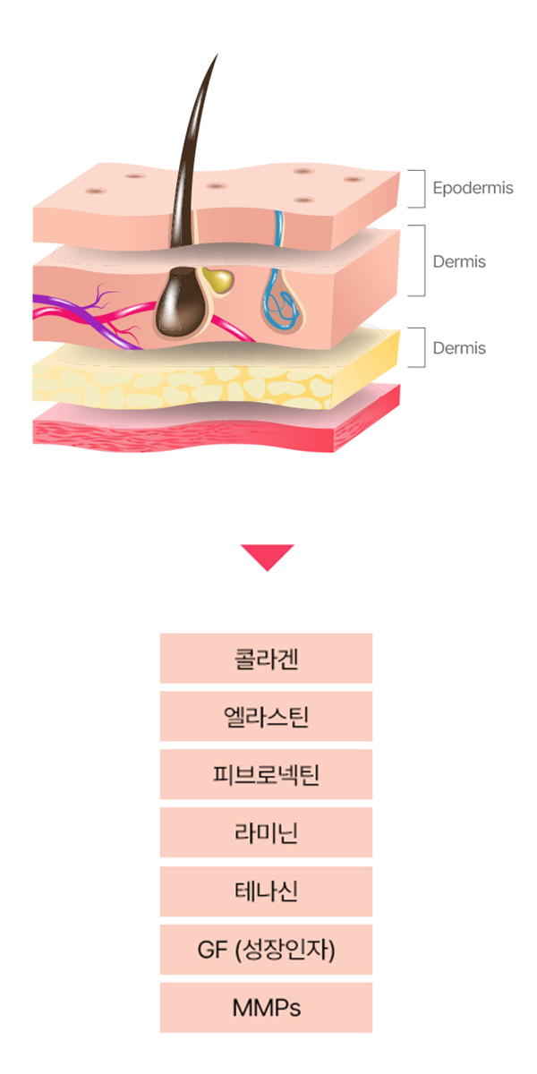 ECM (세포외기질)은 피부 탄력과 구조를 유지하는 핵심 성분입니다.